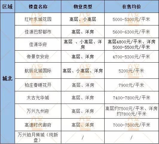 城北在售楼盘较新均价