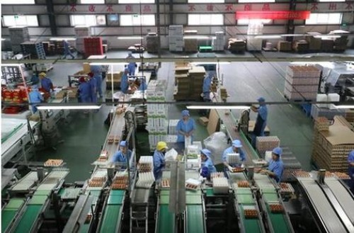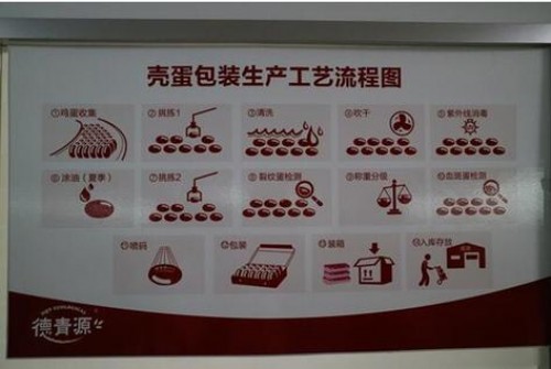 在壳蛋厂的流水线旁,记者了解到,为了全程精心呵护每一枚鸡蛋,德青源采用全球先进的智能化鸡蛋加工系统,所有鸡蛋都必须经过分级挑选、裂纹检测、血斑检测、紫外杀菌、清洗、称重、涂油、喷码等24道严格安全工序,并在48小时之内抵达2亿消费者,以确保鸡蛋的新鲜和安全。