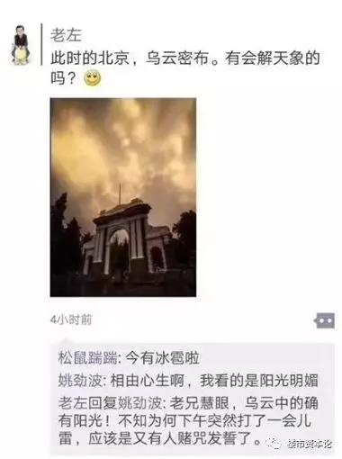当天,左晖发了一条朋友圈:“此时的北京,乌云密布。有会解天象的吗?”58同城姚劲波留言回复:“相由心生,我看到的是阳光明媚。”左晖回应:“打雷应该是又有人赌咒发誓了。”