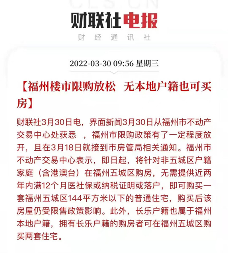 2022年3月30日,据福州市不动产交易中心消息“福州楼市限购放松,无本地户籍也可买房”,不少业内人士表示,这一条消息放出后购房咨询者蜂拥而至,跑步入场的购房较佳窗口期恐怕就在当下。让我们一起来看看新政对于购房者来说有哪些变化。