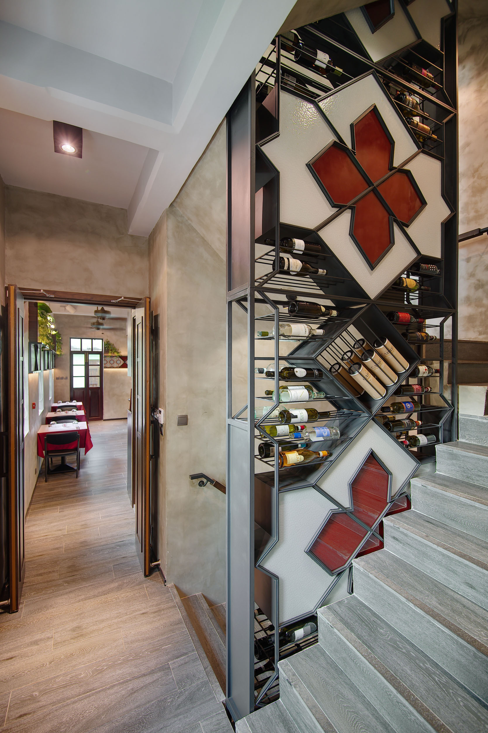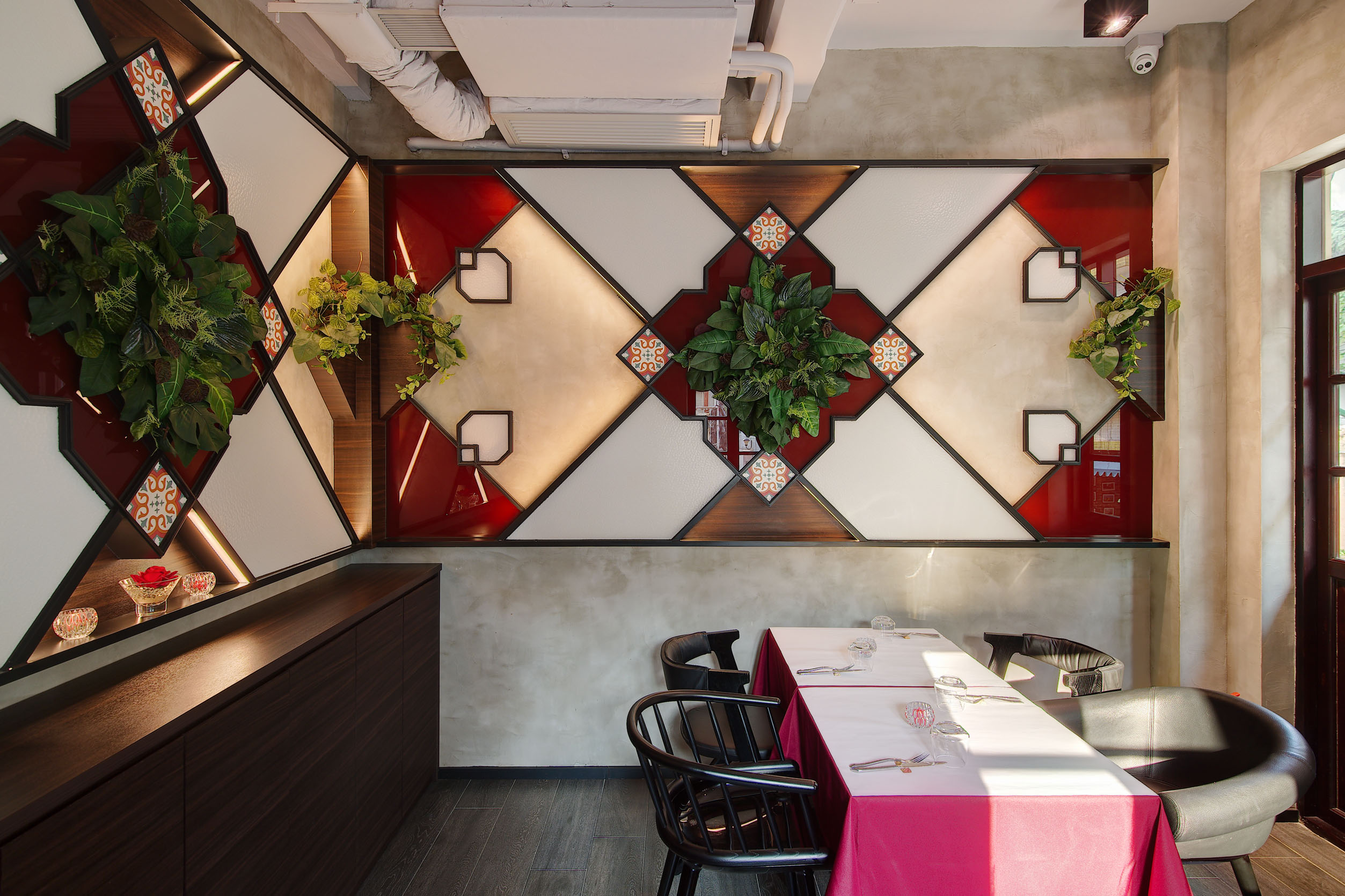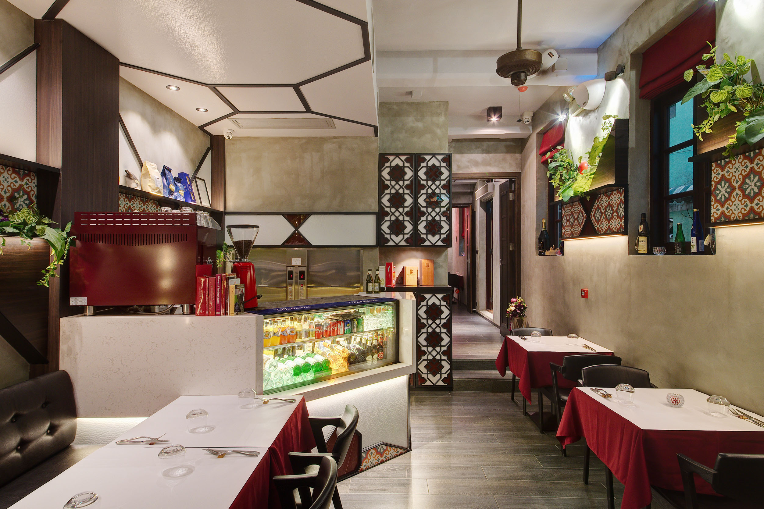 室内装置多暖色氛围,不平滑的米色系墙面如拓印的活泼涂布,地面清一色的暖木色。墙面与室顶的延续性装饰多为八角格纹和方格纹的排序,家具桌椅多为沉调的胡桃色,却都披上了红色桌裙,白桌面。一整个调性融合了中式线条,南洋线条,与葡式的情怀,吃的却是义式的料理,相当多元。