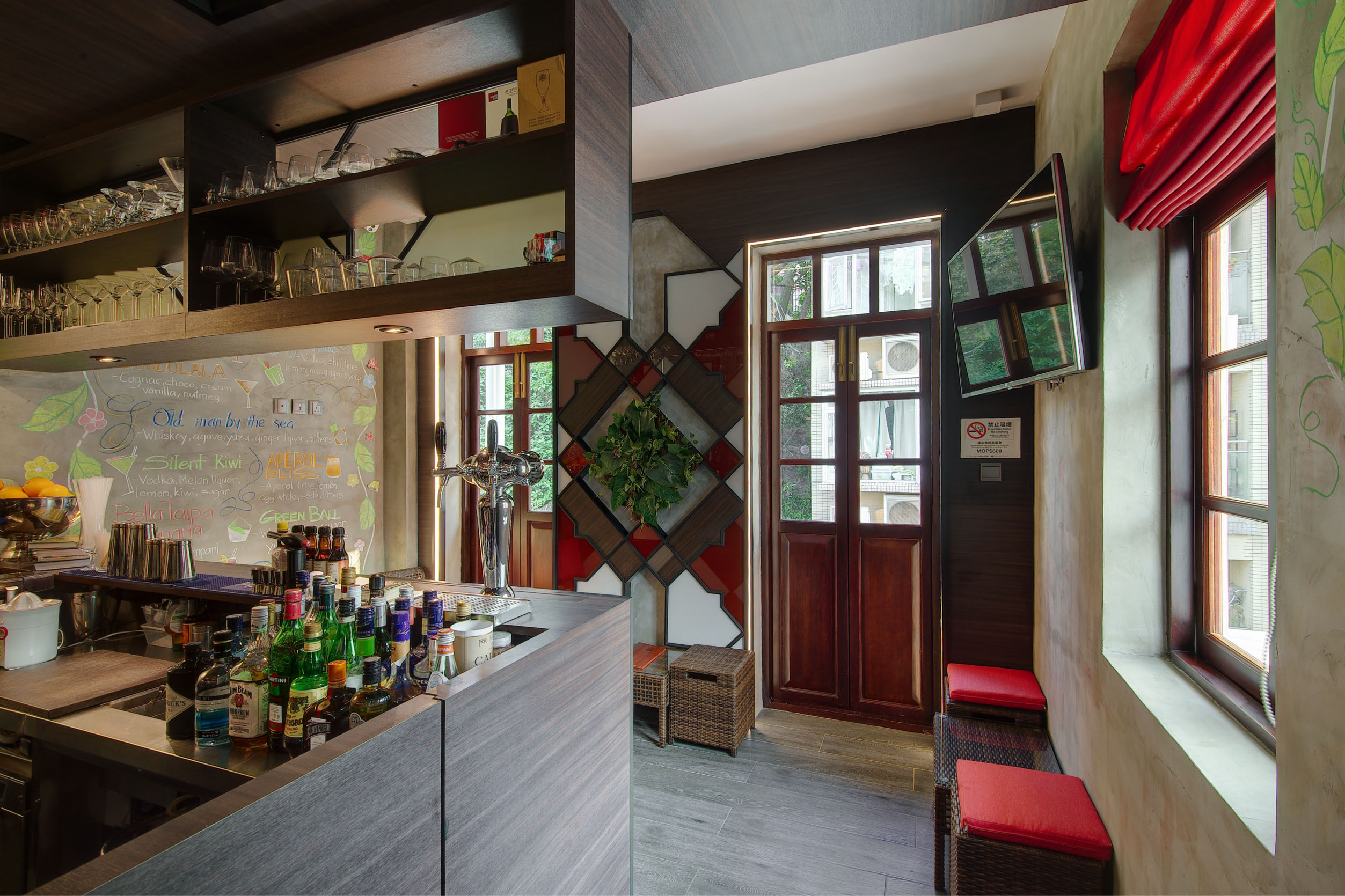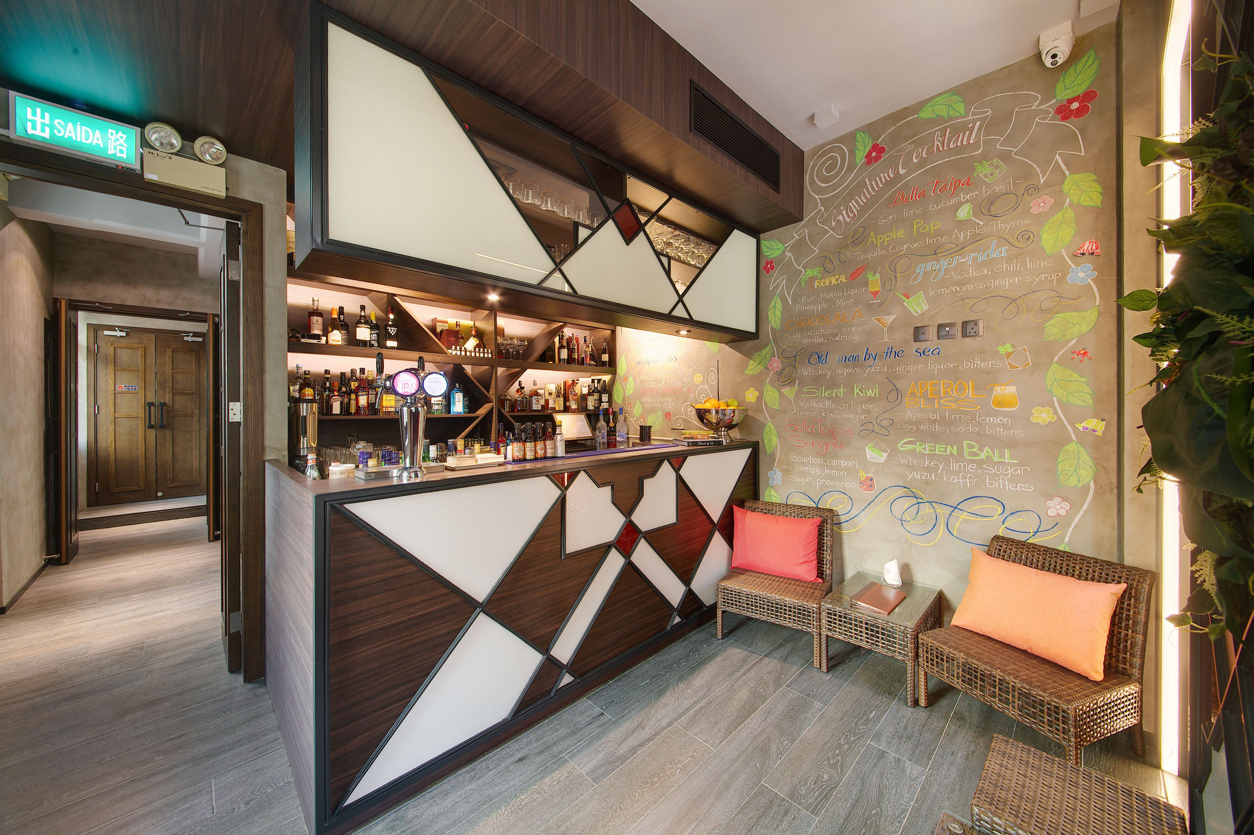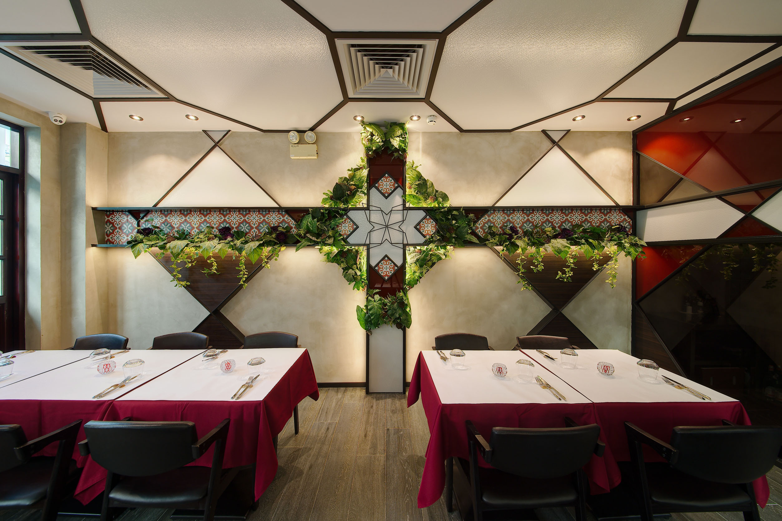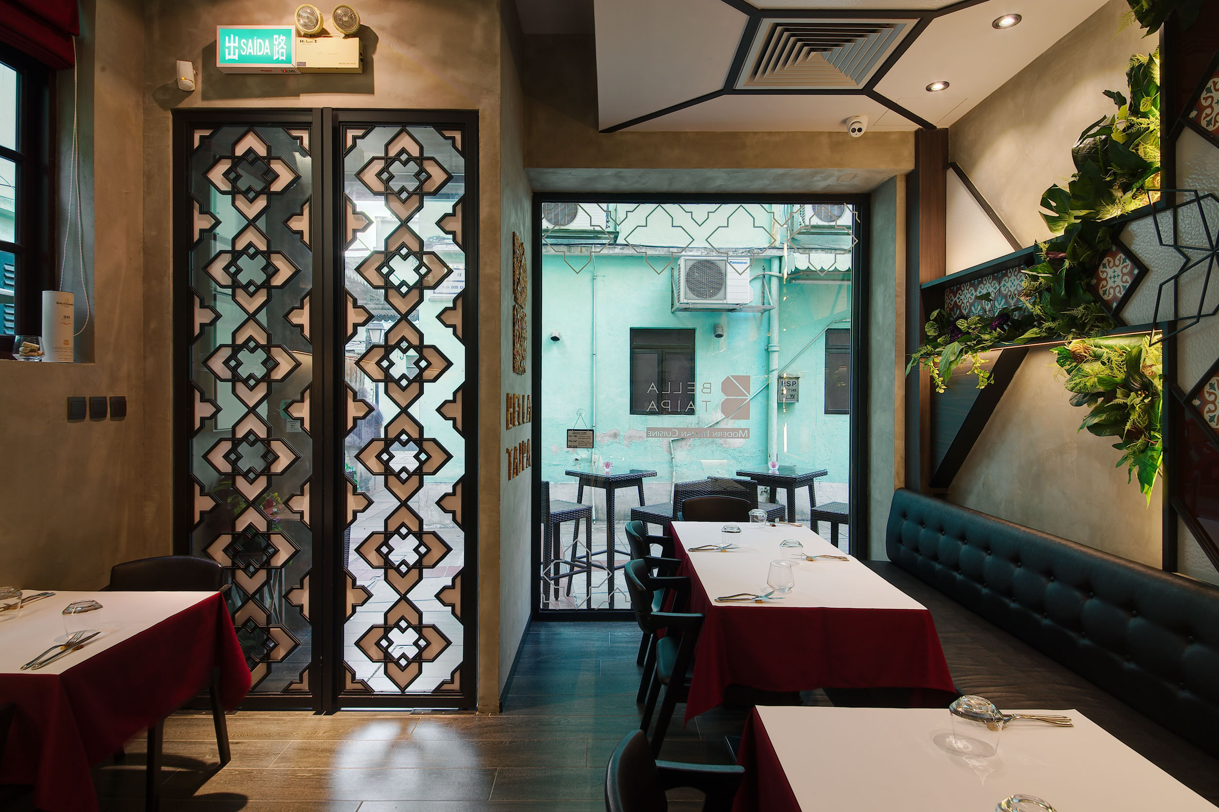 室内装置多暖色氛围,不平滑的米色系墙面如拓印的活泼涂布,地面清一色的暖木色。墙面与室顶的延续性装饰多为八角格纹和方格纹的排序,家具桌椅多为沉调的胡桃色,却都披上了红色桌裙,白桌面。一整个调性融合了中式线条,南洋线条,与葡式的情怀,吃的却是义式的料理,相当多元。