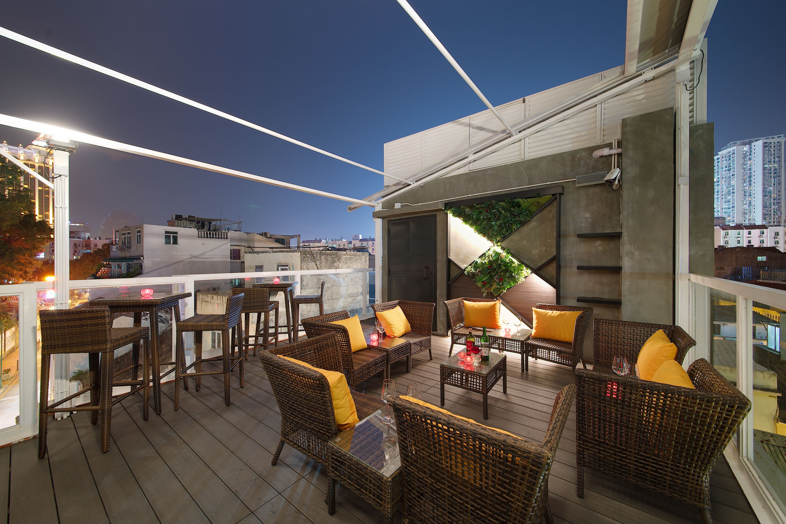 建筑外型另增建屋顶看台,让餐厅多了具创造话题性的空间,看台可俯瞰宁静而历史悠久的老凼仔村。建筑物除为老屋的翻新外,于视觉上须让在地经典风情继续延续,看台的风格期望创造较为现代简约,却不与原建筑的经典有所冲突,设计师以全白(框与条)且通透(玻璃)等建材,让整体协调度相当无违和。无论精神奕奕的暖日或甜蜜的夜晚,看台都成建筑里必经之处。