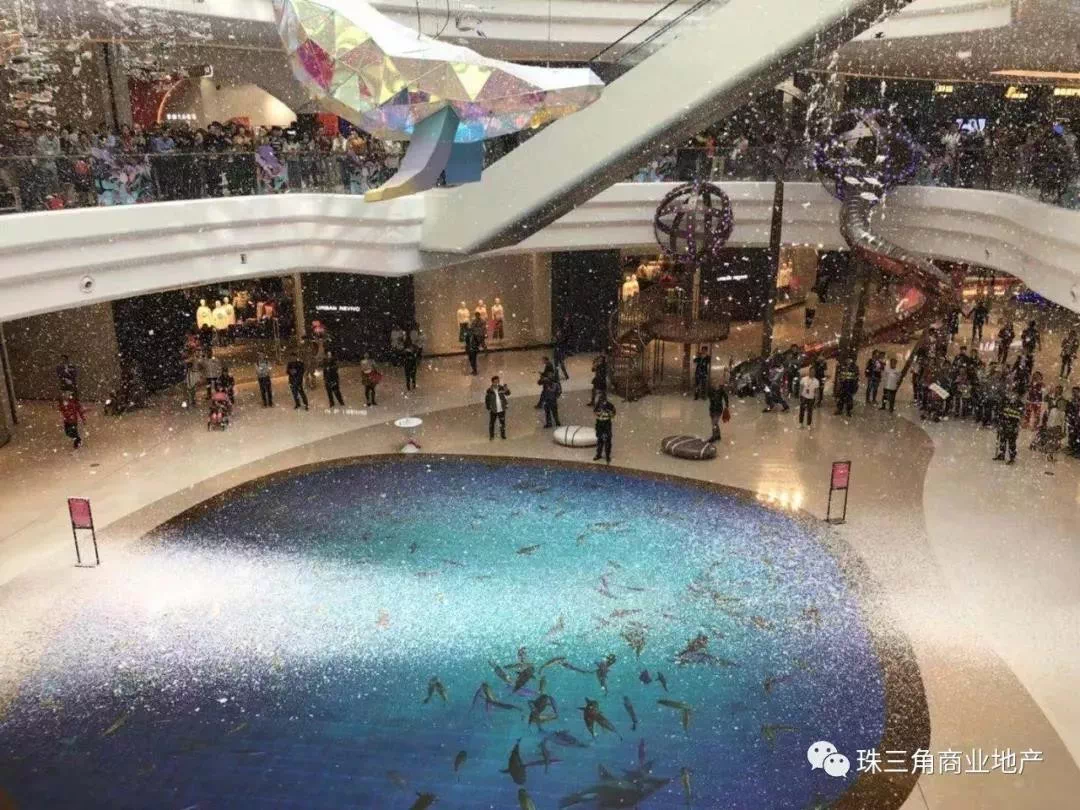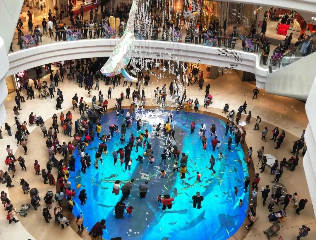 在水中庭邂逅深海精灵——蓝鲸,一起迎接漫舞飞雪,光影科技的植入让人们仿佛置身深海中,情景与场景的互动让这里也成为了较具人气的中心。
