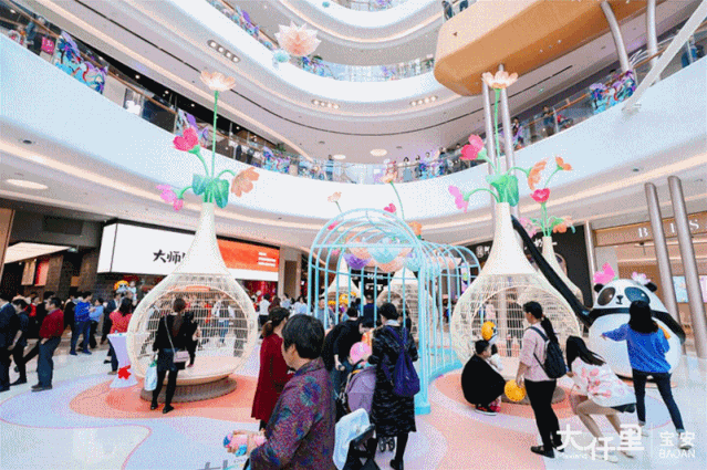 即使是在中庭的打造上,围绕 一个差异化定位和核心策略的方法也一直贯彻在空间印象的工作中。中庭的打造首先要确定主题,所有的空间打造、美陈装置都是要围绕 同一主题。同时要在不同角度和高度摆放陈设品,使陈设品在消费者的移动过程中均可见,且视觉效果良好。