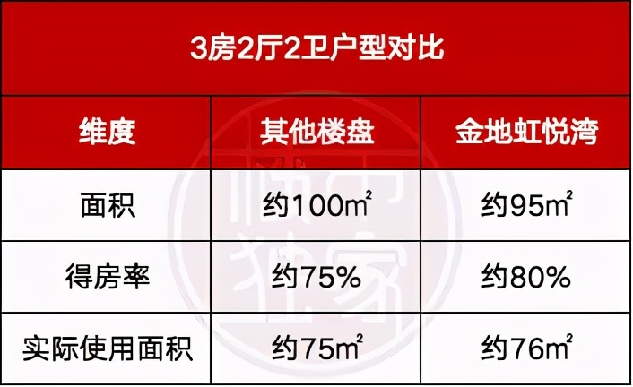 建面约95㎡户型,得房率高达80%,同板块其他楼盘建面约100㎡,得房率基本在75%左右,换算下来,实际使用面积只有约75㎡,与金地虹悦湾建面约95㎡的户型,实际使用面积相差无几。