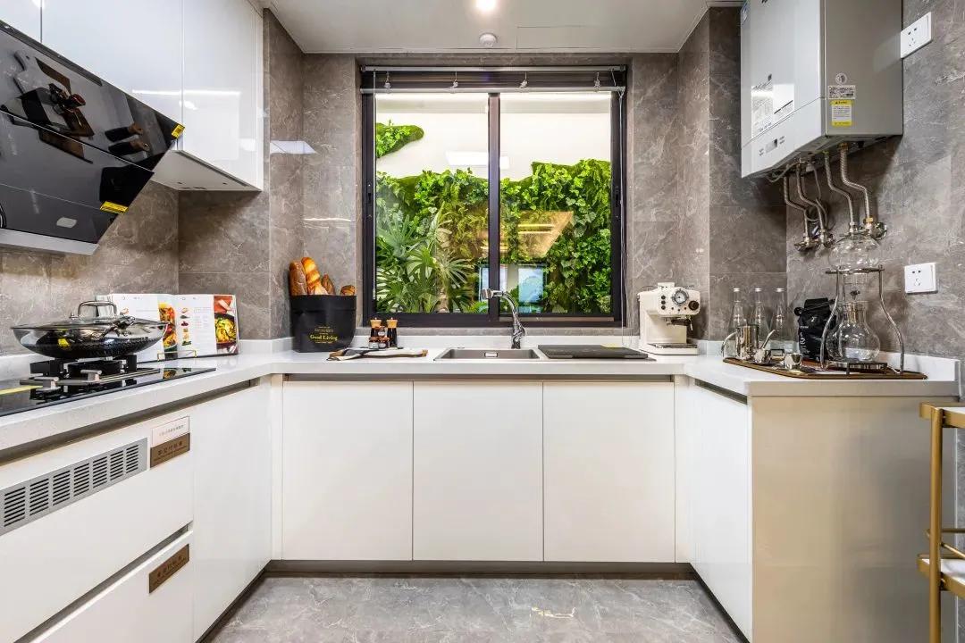 厨房+餐厅+客厅一体化再接大面积阳台,一个南北通透的超级大通厅居于房屋中央,视野无比开阔,尺度感和空间感俱佳。