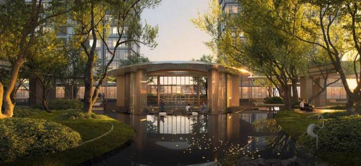 整个园区以围合式布局展开,七幢建筑借鉴中国古典园林的精髓,最大楼间距达到了63米,使得每栋楼都能享受到270°的开阔视野,仿佛是一座座隐匿于花园中的岛屿。为了与景观相呼应,园区立面采用“水晶天幕”设计,线条纤细,使建筑宛如天空中垂下的纯净湖面。