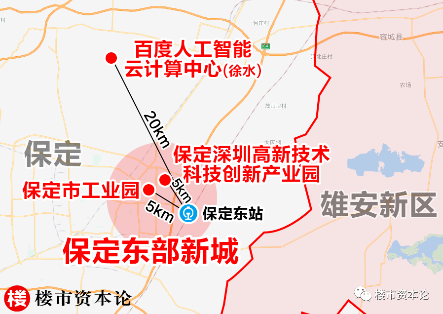 楼市资本论发现,中国移动(保定)数据中心所在的工业园区和以电子信息、高端智造等产业为主的保定深圳高新技术科技创新产业园,都位于保定东北部的莲池区,距离保定东站直线距离仅5公里左右。百度的人工智能云计算中心也将落地位置选在了更靠近雄安的保定徐水和定兴。