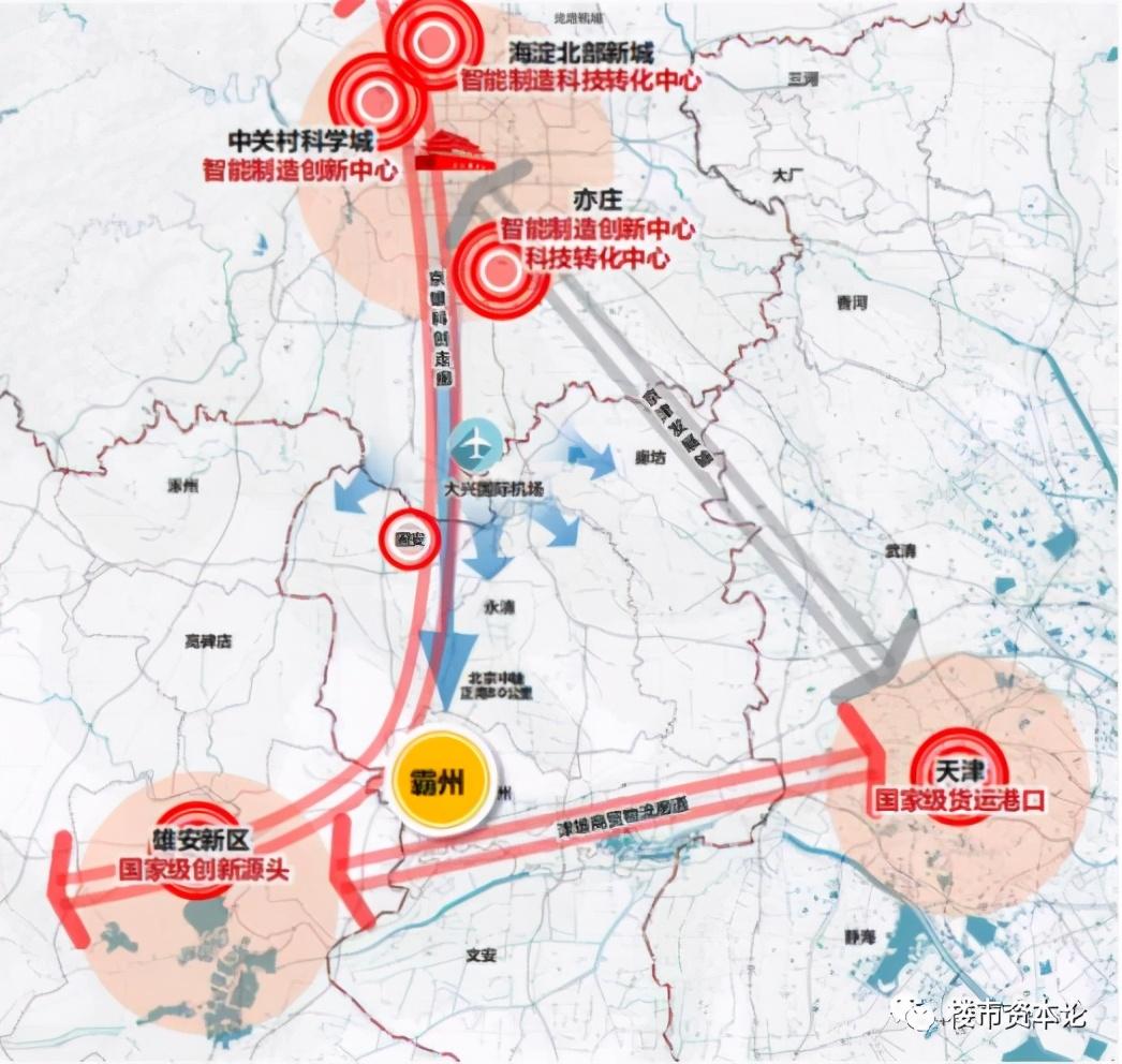 楼市资本论发现,霸州是京津冀城市群中,继北京和天津之后,少有拥有3个轨道站点的枢纽城市,也是京津冀地区同时面向京津雄三个区域增长极的黄金枢纽。