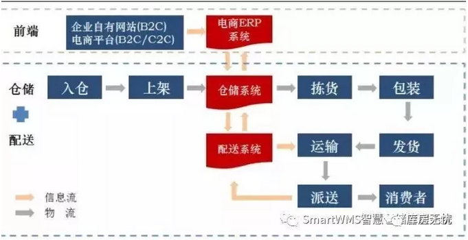 在传统的物流中,顾客向商家下单后,商家通知快递公司取件,然后快递公司进行转运、配送。而仓配一体化之后,整个物流被分割成了跨区间的信息流动+同城之间的包裹流动,也就是说顾客在下单之后,商家接单之后,利用信息系统与快递仓库对接,之后从仓储操作到配送都是由快递公司来完成的。而信息的流动是仓库WMS 系统和卖家ERP 系统对接传输的,可以说是即时的。