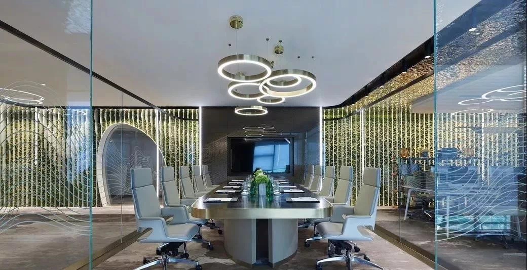 室内办公空间设计部分,沿用了原建筑 “山水城市” 的概念,配合技术创新与改造,构筑一个都市中的逆世界,天花顶部似水,墙面线型为山,地面像漂浮着的云朵图案地毯,各种元素都融入生态、生命力与情感,打破原有室内空间形态,打造逆空间的视觉效果。