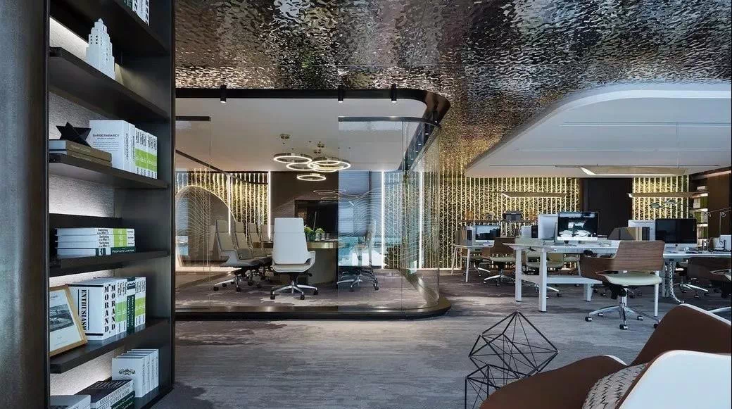 利用玻璃不受光的特性做表面雕刻磨砂处理,配以灯光呈现奇幻效果,随着“山””水””云“共同涌动,营造流动变幻的异象空间。入门设置企业文化展示区,让空间更有层次感。去前台化理念,接待台与水吧结合体现新一代办公的开放性与体验性。