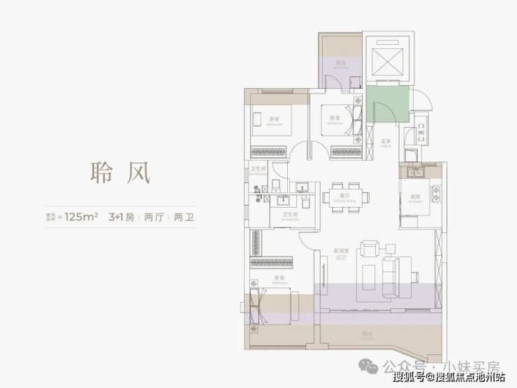105平三房南向开间达11.3米,客厅开间5米,125平做的四房两卫,南向开间13.4米,客厅开间6.7米,独立电梯;142平四房南向开间达15.5米,可以改造为4+1房,采用子母门设计,还有独立储藏室。