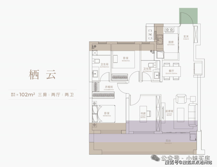 115平户型做成了端头边户,这个还是比较少见的,客厅放在了北面,并且设置成了270°全景舱户型,这样就能直接俯瞰小区内部园林;卧室全部设置在南面,保证了充足的光照。