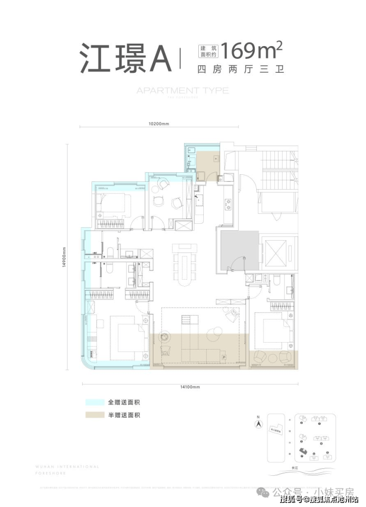 据了解,169平户型南向开间约14.1m,三面采光面逼近约40m,主卧享270°江景视野,实得面积可以比肩市面原先约200㎡的产品。