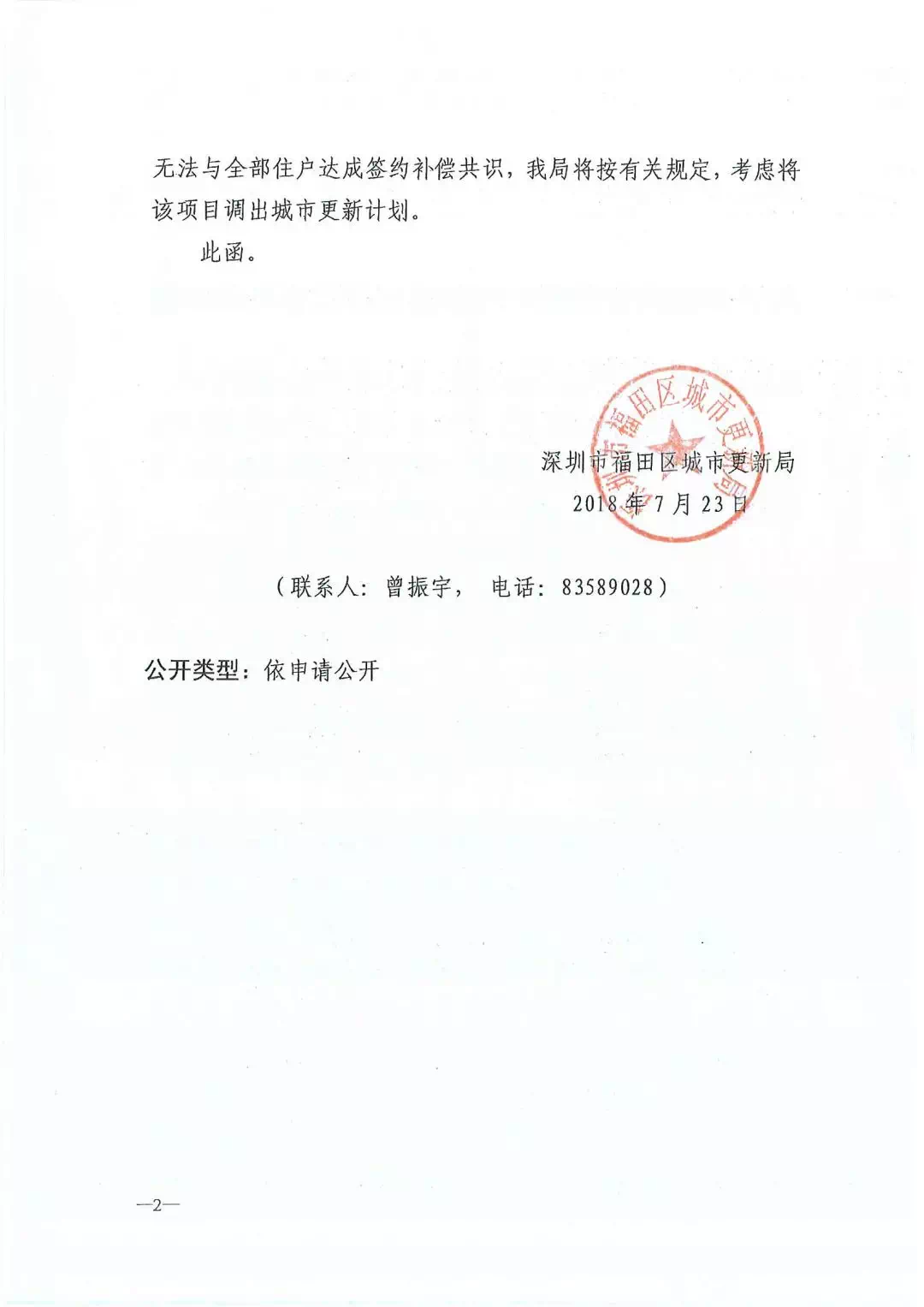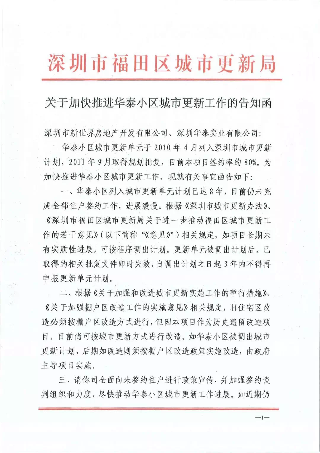 《告知函》主要内容是:华泰小区列入城市更新单元计划已达8年,目前仍未完成全部住户签约工作,进展缓慢;按《关于进一步推动福田区城市更新工作的若干意见》相关规定显示,更新项目因长期未有实质性进展,可按程序调出更新计划,更新单元被调出计划后,之前所批复的文件将付诸流水,且3年内不得再申报更新单元计划。