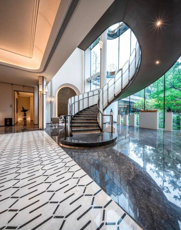 源自于海派的DECO精神,上海·招商臻境从海派经典的建筑中截取元素及融合,例如立面采用经典弧线设计,质感与风情的交织融合彰显上海格调;旋转楼梯、穹顶泳池、邬达克水院、香樟花园等时刻体现优雅;白色岩板与拼花地面、不锈钢镂花电动门等展现细节……总之,摩登都市风格是一种融合了传统与现代、精致与典雅的设计风格,体现对生活的情怀和对文化传统的珍视。