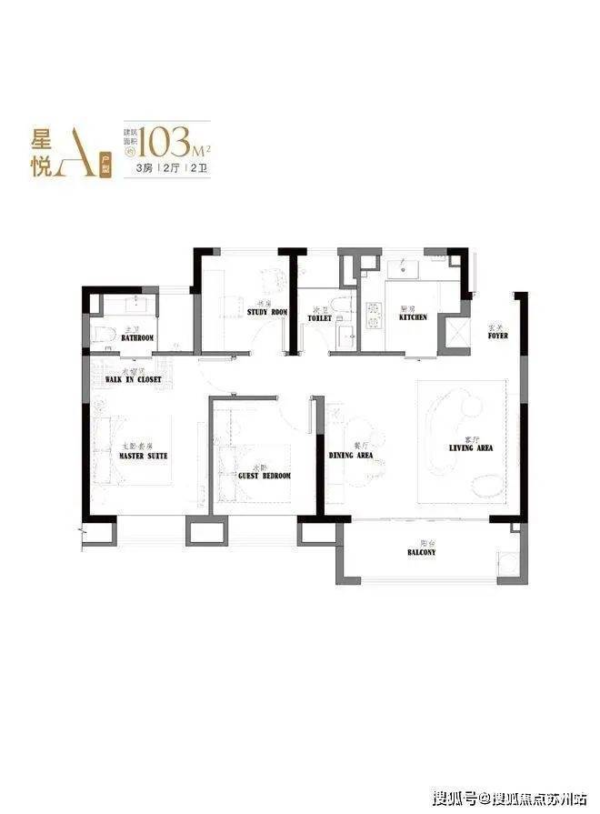 107㎡是103㎡户型的PLUS版,厅面宽达到5.5米。汲取了103㎡户型所有的优点;如餐客厅一体,U型厨房,动静分离设计,大尺度主卧套间,以及每个卧室都赠送大面积飘窗。