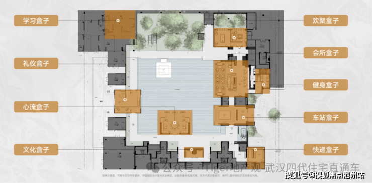 湖北科投|万科·光谷锦上围绕中央庭院,打造了礼仪盒子、心流盒子、会所盒子、欢聚盒子等九大功能盒子。