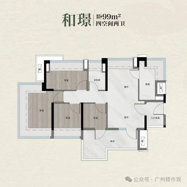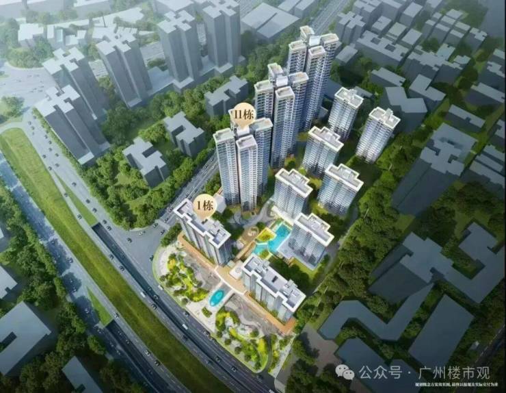 项目位于番禺大石板块,由11栋住宅(3栋两梯四户塔楼,8栋两梯两户板楼)和5500㎡的公服配套围合而成。