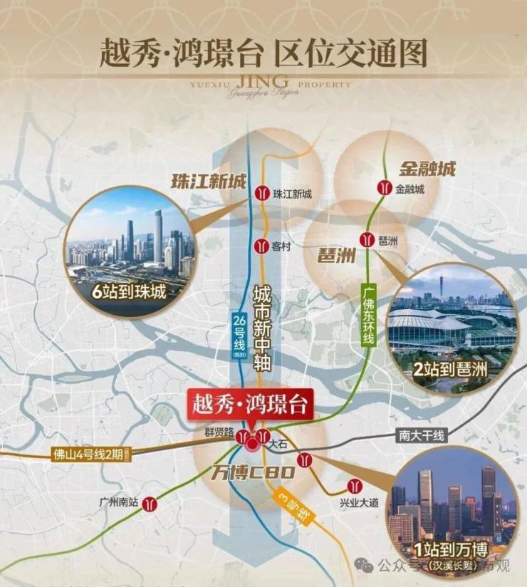 步行约700米至3号线大石站,1站万博,6站直达珠江新城。广州城际大石东站,2站琶洲、3站金融城,与3号线双轨交汇。临近26号线群贤路站(规划中,首次环评已通过),5站客村,6站珠城,与3号线平行有效分流通勤。