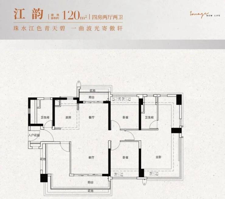 ②建面约120㎡:四房两厅两卫设计,共有2个户型可选,四开间朝南,居住与生活动静分离,南向大阳台或南北双阳台,主卧带270°飘窗