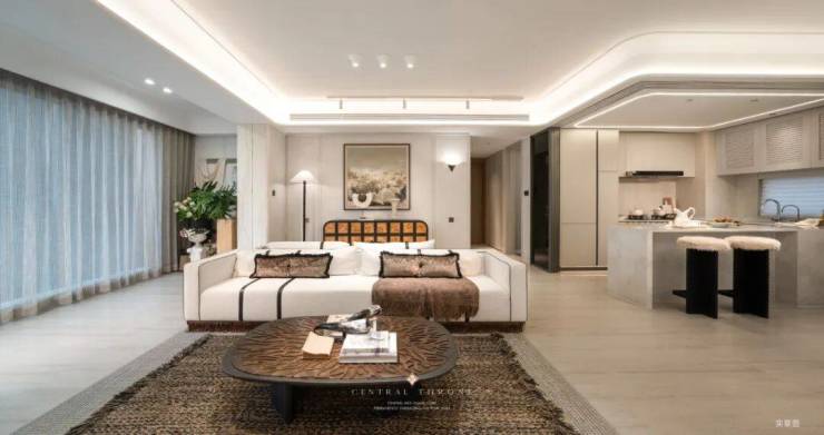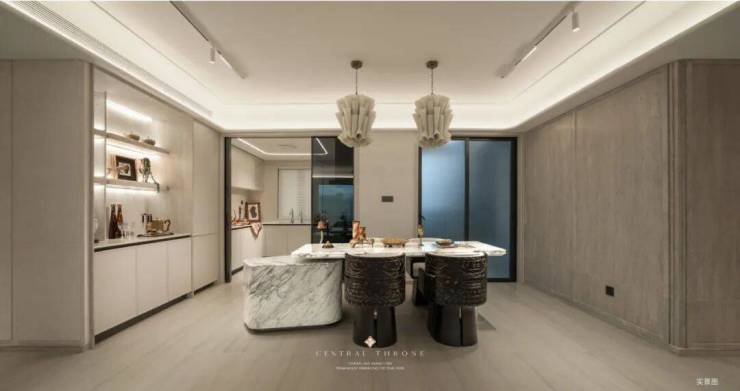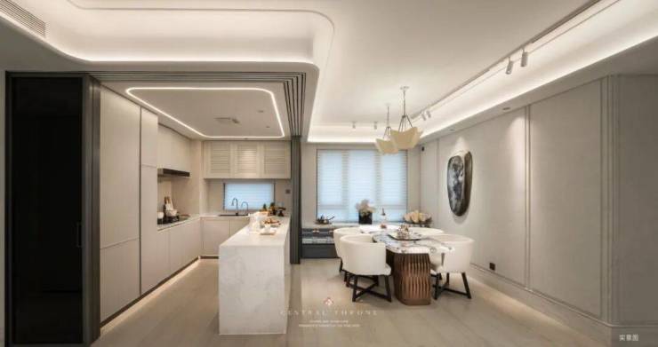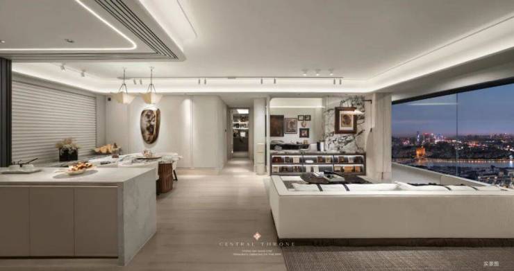 约12m南向黄金面宽,为生活拉开了一道巨幕,阳光从清晨到黄昏自由流淌,让每个房间都浸润在自然光的温柔里。近60㎡LDKGX一体化无界方厅,打破了传统空间的割裂感。开放式社交岛台串联起中西厨与互动场域:先生在中厨烹饪家常菜,太太在西厨准备甜点,孩子在岛台上写写画画,彼此视线相通,互动自如。米其林级的家宴、闺蜜的下午茶、亲子烘焙的甜蜜时光……空间的流动感,让情感的联结更加紧密。