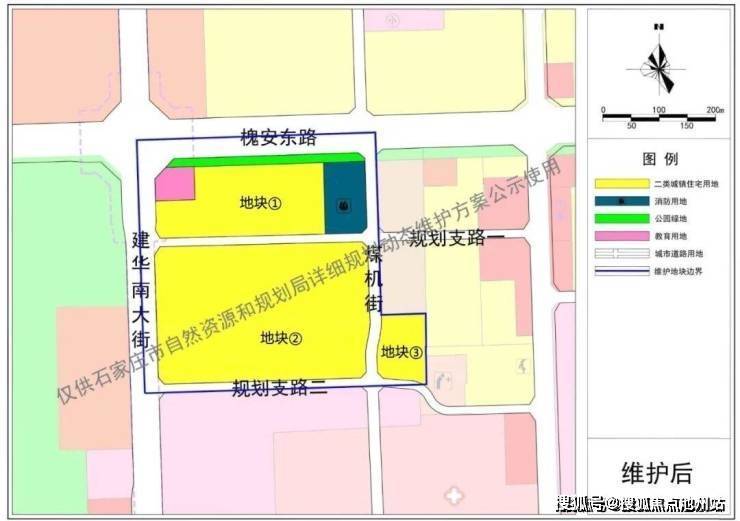 我们将其分为三个地块。地块①位置优势明显,紧邻槐安东路和建华南大街,一路之隔便是裕华万达,但它的用地性质较为复杂,除了主要的住宅用地,左上角为教育用地,东侧为消防用地。