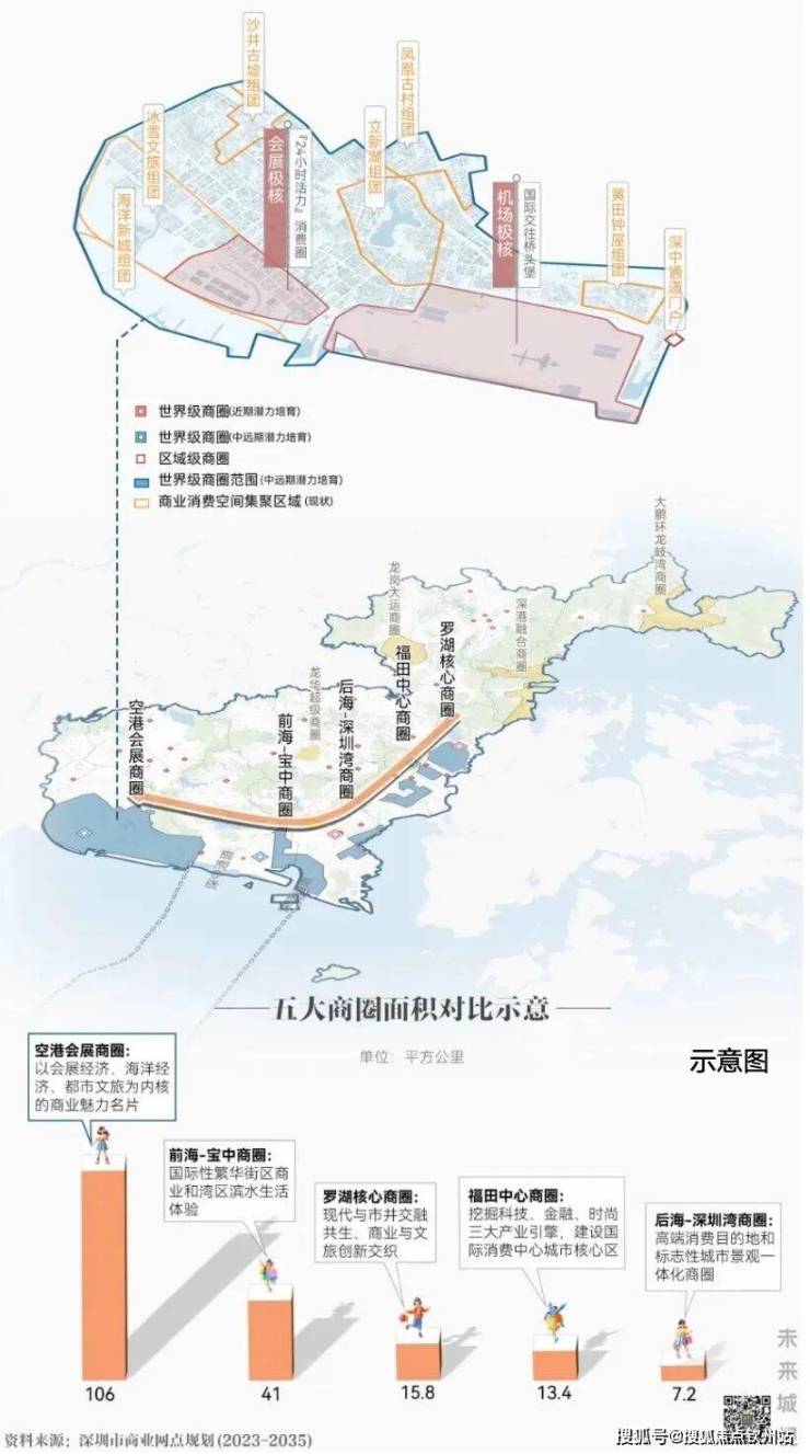 2023年8月,深圳规划了5大商圈,其中四个在深南-滨海沿线范围。只有“空港会展商圈”,另辟一个新的商业未来。