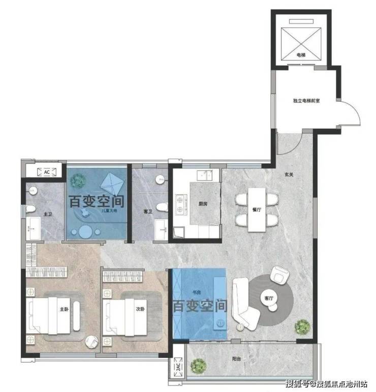 建面约99平户型,打破常规,空间布局设计优化到了极致,赋予其独立电梯厅、通透三房、双卫设计的高配置。