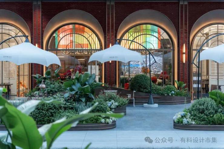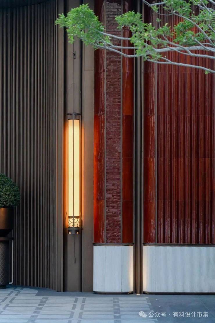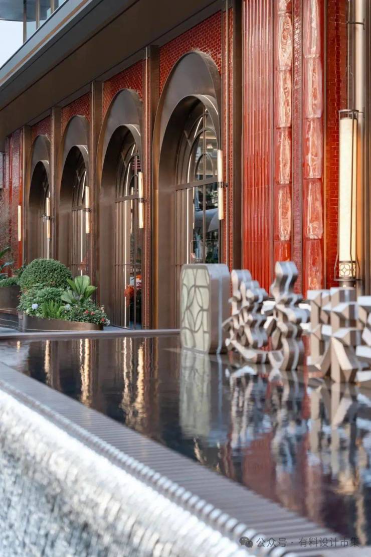 主入口提取大元帅府建筑拱券元素造型,融入现代材料与设计手法。中轴对称,整体裙房采用石材、陶釉砖、铝板及格栅、涂料等材质,展现丰富的细节与层次。细部融入岭南元素,共同构成广府系宜人界面。