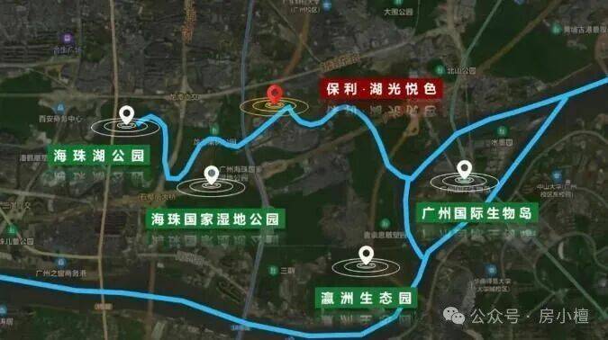 周边 3km 范围内有 125 个公园,距离最近的仅 475m,海珠湿地公园就在旁边,此外 3 公里范围内还有海珠湖公园、瀛洲生态园、广州国际生物岛