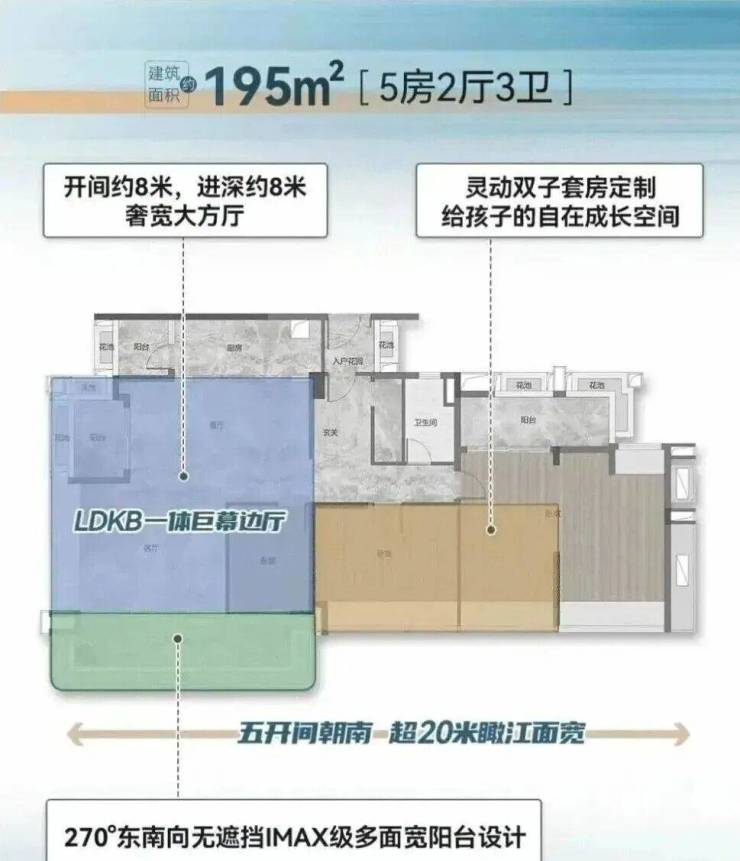 195㎡大四房户型,阳台长度做到约8米,整个LDK客餐厅面积约达到70+平,两侧观江面加起来更长达约16米!不夸张的说,整个LDK空间感堪比酒店的江景宴会厅!