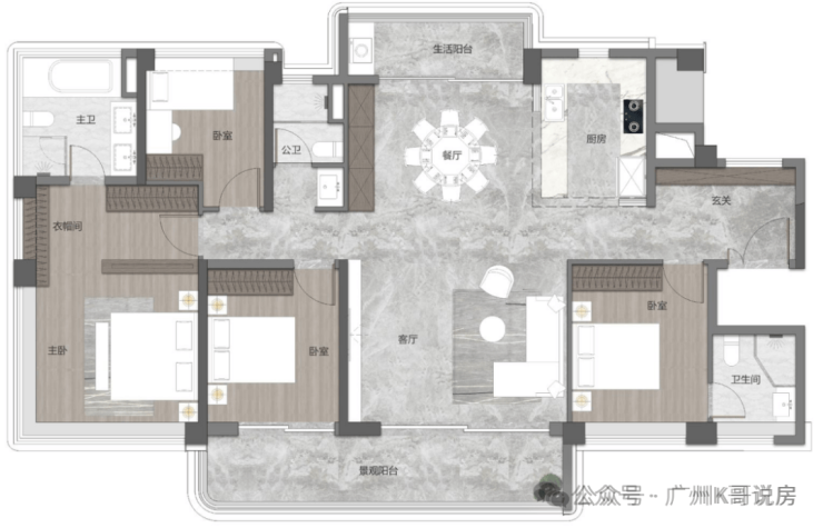 138㎡四房户型,做到了四开间朝南,约16.6米大面宽,而且餐厅带飘窗,做到了南北对流,主卧还配置了独立衣帽间和超大收纳柜,很适合二胎家庭居住。