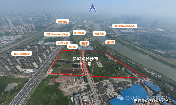 地块位于雨花区高铁新城片区,长托路以南、雨花大道以东、浏阳河以西、18号路以北。宗地面积11.92万方,容积率2.89,计容建筑面积34.44万方,规划用途居住用地,建筑控制高度80米。一线临浏阳河位置,紧邻建发玖洲和玺项目,分为东西两个地块,与会展新城板块一河之隔。