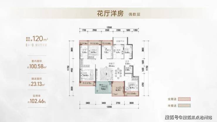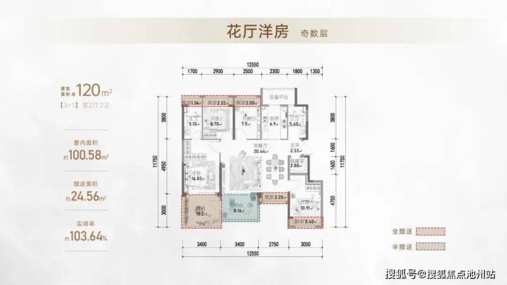 120平洋房奇数层:设计3+1房两厅两卫,约6.3米挑空露台+5个飘窗+四开间朝南,整体赠送面积超24平,实得率超103%!
