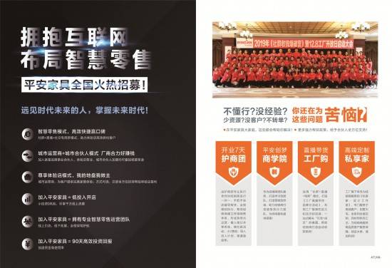 当大量的家具品牌还在传统实体店苦苦挣扎时,平安家具积极布局互联网营销,与消费者0距离亲密接触,为合伙人打通线上壁垒,共赢未来!