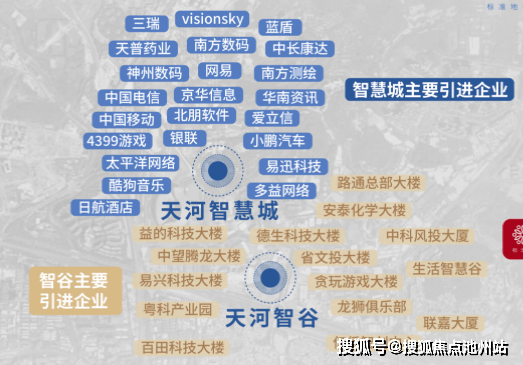 天河智慧城核心区,这里汇聚有网易总部、酷狗、南方测绘、小鹏汽车、极飞科技等企业大咖,此外德生科技、北明软件、极飞科技等新兴的高科技企业也纷纷进驻于此。