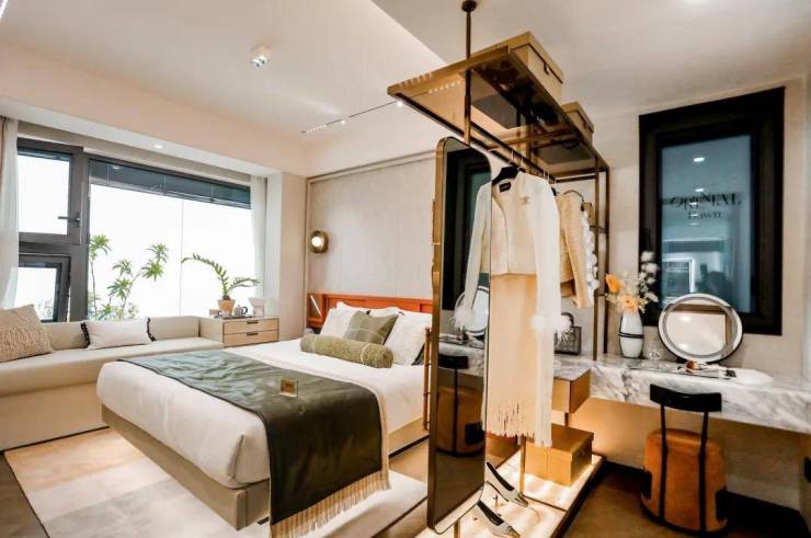 人们对于建筑的感知往往从外立面开始,而绿城是打造外立面的高手。春晓园的外立面结合纽约切尔西艺术区为灵感,采用香槟金线条勾勒浅灰色建筑,构筑纤细且精致的超扁平外立面;当阳光照在立面之上,天光云影在玻璃镜面中游走,仿若一个个“城市油画框”,框定一副副流动的画。