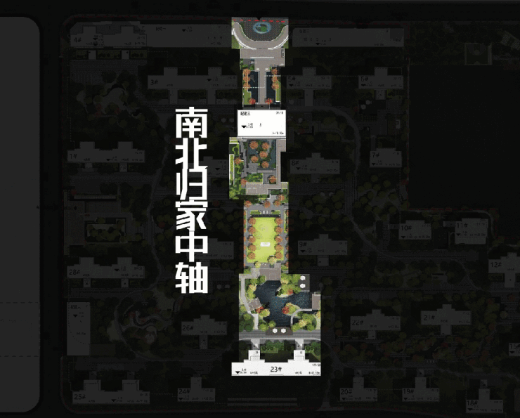 再看体北金茂府,规划了一条纵贯社区南北的景观主轴,从最北侧大门延伸至最南侧23号楼。