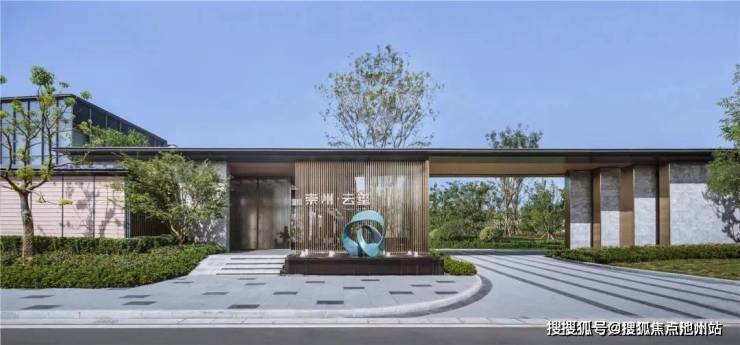崇州云玺社区入口横向飘檐和层层错叠的片墙,搭配铜色格栅、雕塑的设计,形成独特而富有昭示性入口。