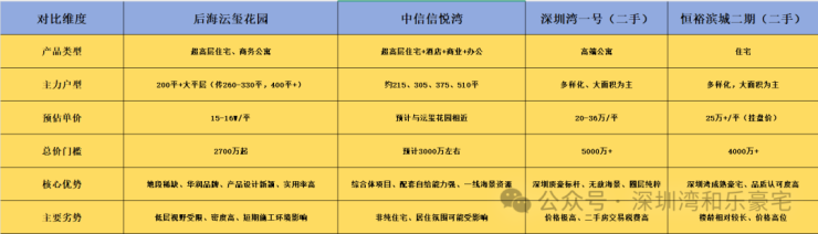 后海沄玺花园并非孤品,它与周边一些高端项目共同构成了深圳湾一线的顶级住宅选择。以下是它与主要竞品的对比情况: