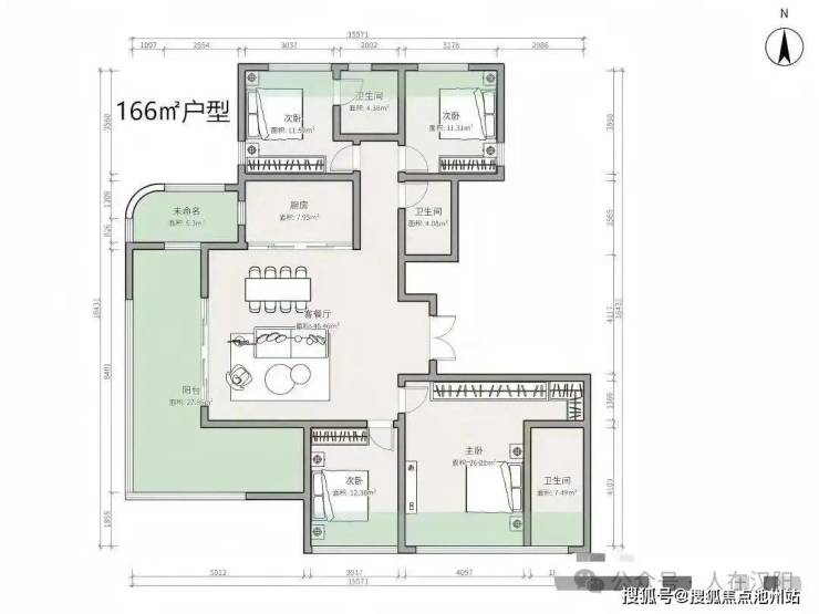 建面约167平,四房两厅三卫: