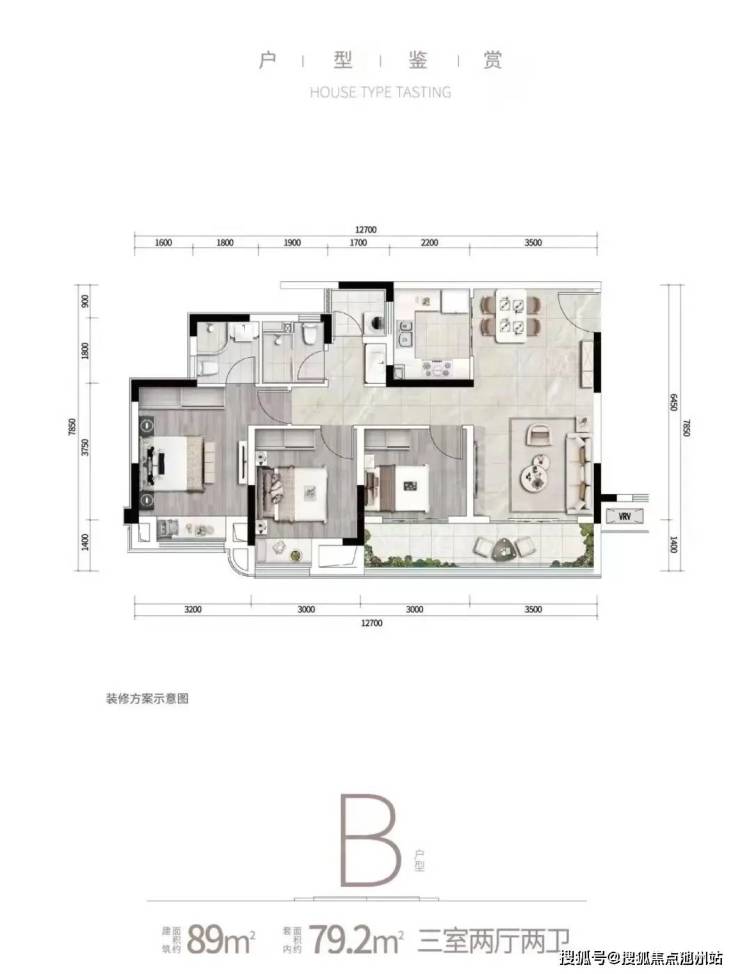 89㎡三室两厅两卫:南北通透,全明格局,户型方正,赠送飘窗和阳台,空间利用率高,采光通风良好,适合刚需家庭。