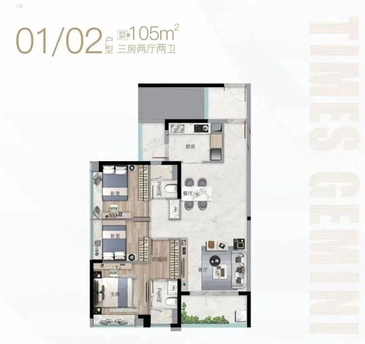 时代珑星共两栋楼,分别是G1栋和G2栋。从外形上看,G1栋算正常,蝶形设计,两梯六户,户型为99-106平三房;G2栋外观略显独特,G2栋推出的面积段为62-79㎡精奢小户住宅。
