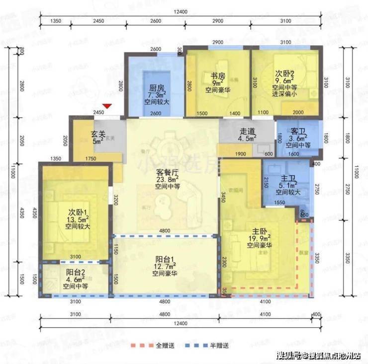 ❸建筑面积约139㎡C2户型,4房2厅2卫,含赠送得房率约85%。