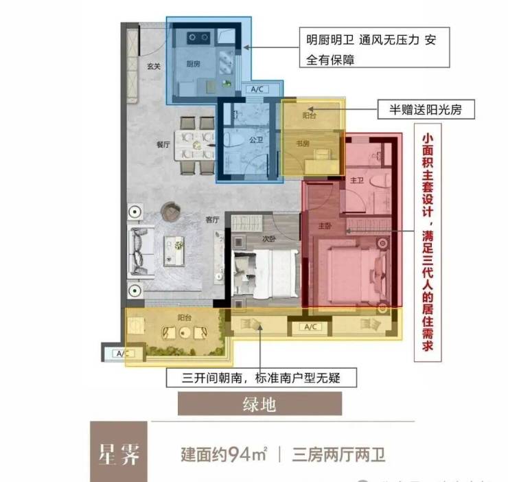 📣约94㎡三房二厅二卫:南向主套,明亮通风,部分阳光房赠送!!