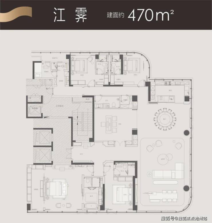 470㎡户型也是采用LDK客餐厨空间一体设计,拥有270°大弧形型玻璃幕墙环幕江景。本次户型最大的升级在于,在原有的基础上将十字中轴的一侧过道融合进X空间,让该空间尺度更大,可打造个性茶室/收藏馆/健身房等等,新增朝向客厅方位的开门,让X空间无缝联动环幕客厅、面向江打开,形成双客厅社交剧场。