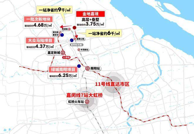 左边11号线嘉定北站旁,一批次地块最新联动价4.68万/㎡,相隔一站,金地嘉境100㎡户型尽省约90万!